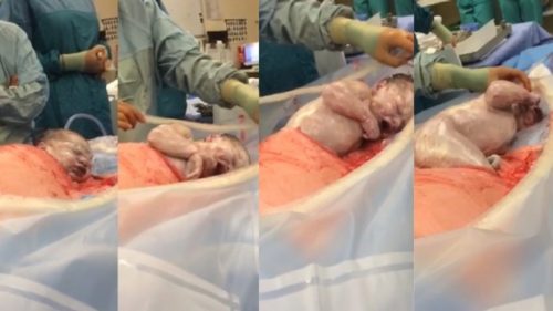 In the video, the little baby boy was seen effectively delivering himself, and wriggling his way out of his mother’s stomach through an incision made during caesarean instead of being removed by the doctor.