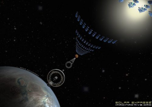 Solar Express would use rocket boosters, keeping a small amount of fuel on reserve to adjust course for its launch. Then, the train would slingshot around celestial bodies to gain speed without needing more fuel.