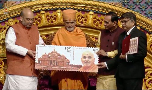 Government of India pay tributes to Pramukh Swami Maharaj by releasing postage stamps of Swamiji and Swaminarayan Akshardham.
