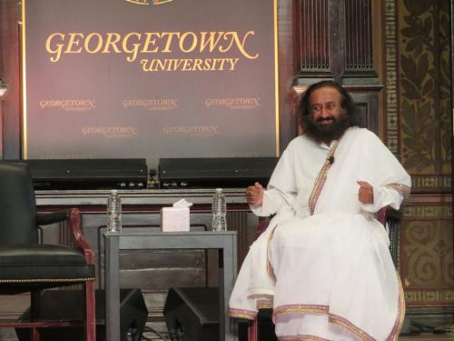 WASHINGTON, DC: Addressing a packed hall at the prestigious Georgetown University on a Sunday evening, world renowned spiritual leader, humanitarian and peacemaker Sri Sri Ravi Shankar shared his unique knowledge of meditation and the important role it can play in overcoming polarization.