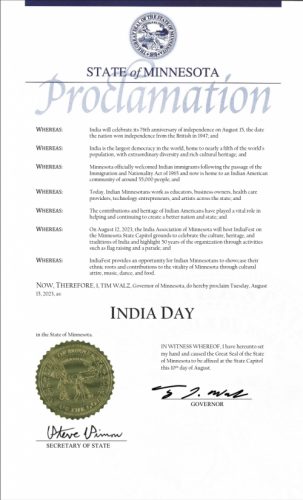 NOW, THEREFORE, I, TIM WALZ, Governor of Minnesota, do hereby proclaim Tuesday, August 15, 2023, as: INDIA DAY