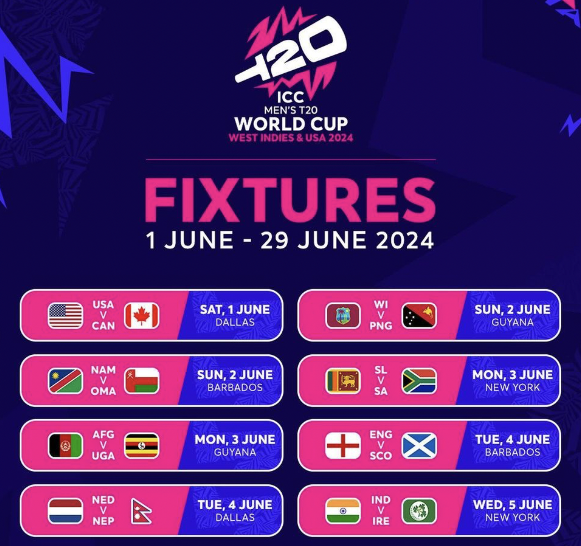 Commencing on June 1, 2024, this cricketing extravaganza is set to kick off with an electrifying clash between co-hosts the United States and their northern neighbors, Canada, right in the heart of Dallas, Texas. The cricket fever doesn’t stop there, as the West Indies, another co-host, step onto the field the very next day in Guyana, squaring off against the formidable team from Papua Guinea.