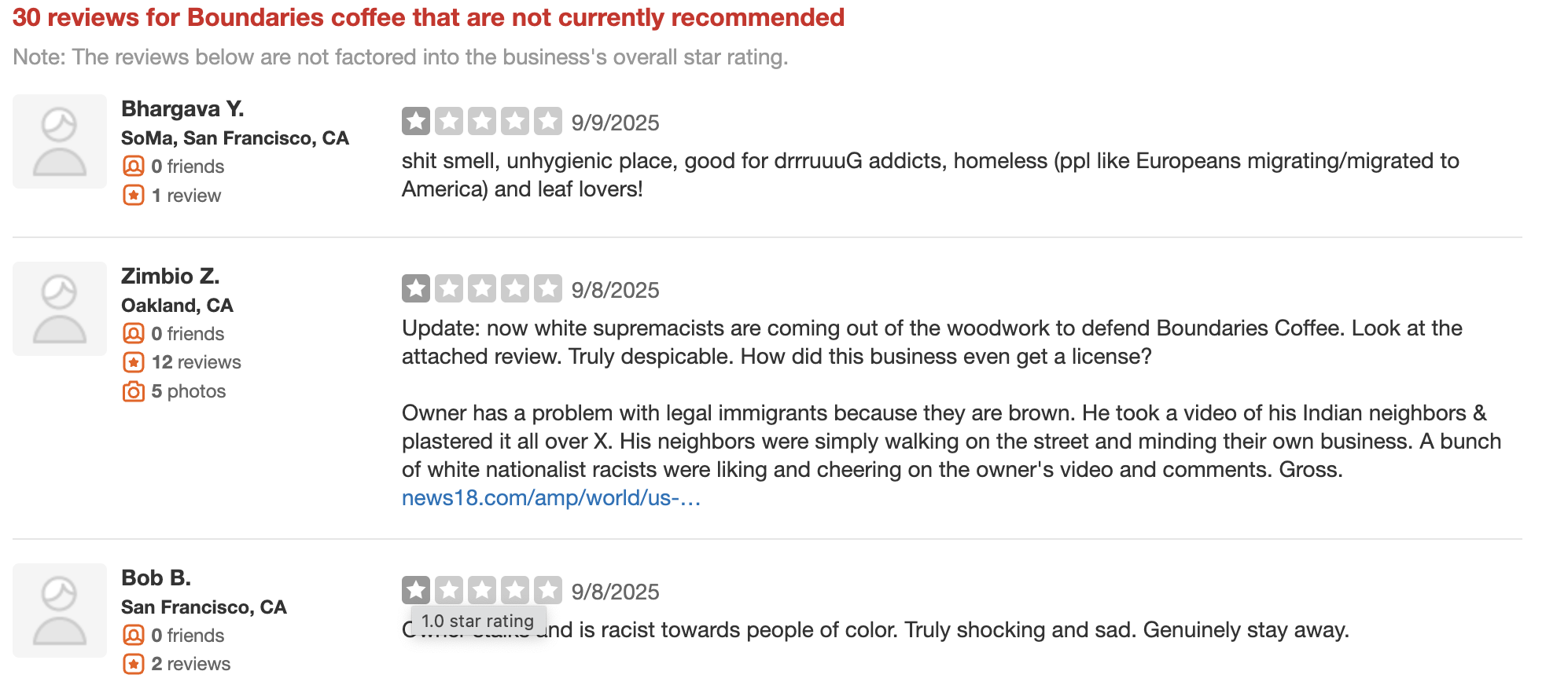 One review read: “Owner has a problem with legal immigrants because they are brown. He took a video of his Indian neighbors & plastered it all over X. His neighbors were simply walking on the street and minding their own business. A bunch of white nationalist racists were liking and cheering on the owner’s video and comments. Gross.”