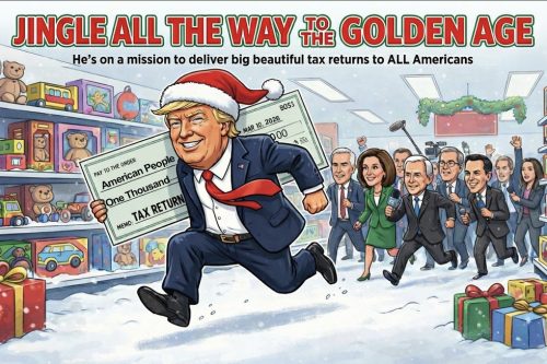 “JINGLE ALL THE WAY TO THE GOLDEN AGE: He’s on a mission to deliver big beautiful tax returns to ALL Americans,” read an accompanying illustration showing Trump in a Santa hat running to deliver tax refund checks — or was he running with all the goodies for himself, suggested carping critics.