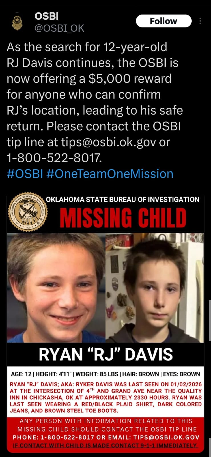 Meanwhile, the search for Ryan continues with urgency. The OSBI has announced a $5,000 reward for information that can “confirm RJ’s location, leading to his safe return.”