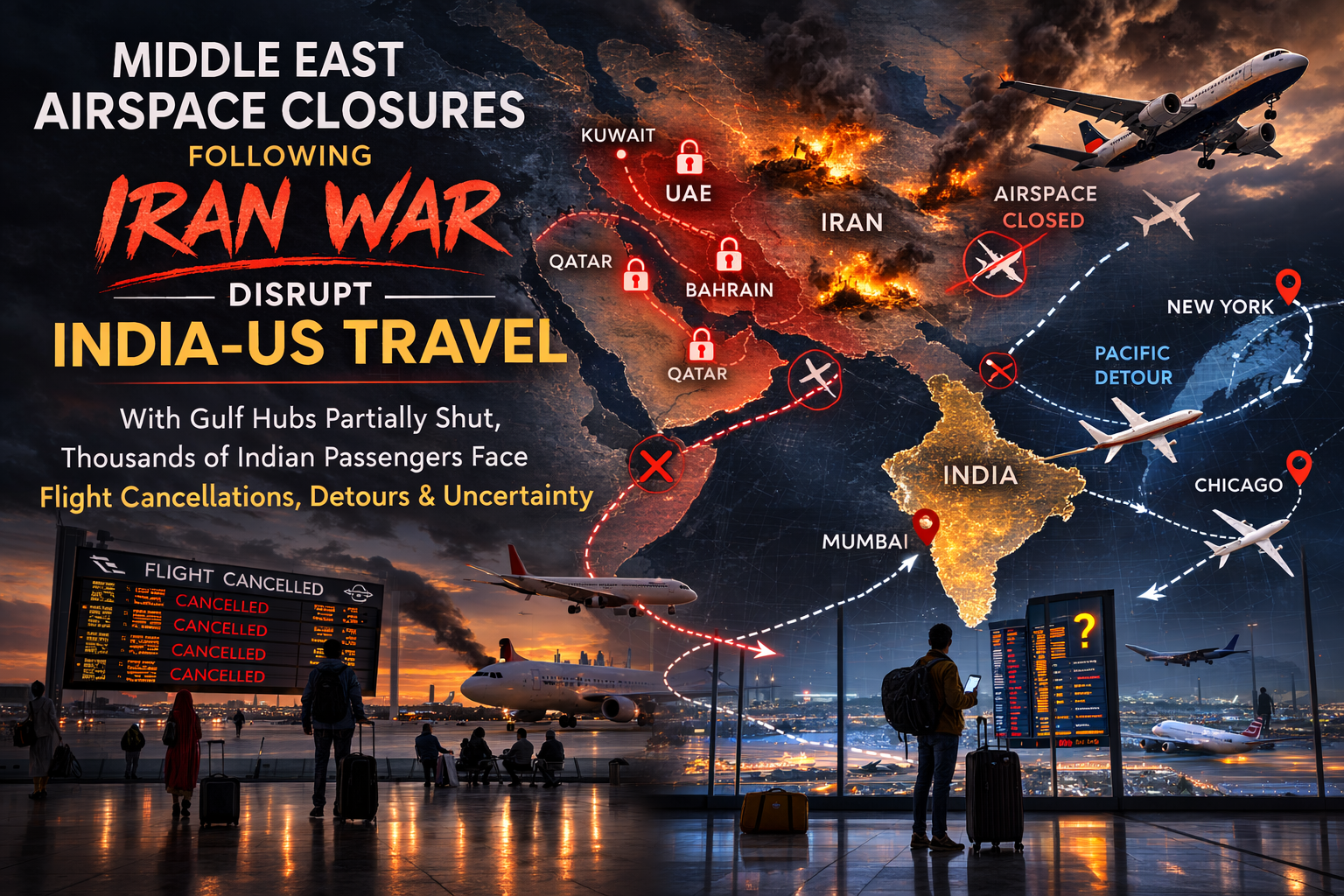The ripple effects are being felt far beyond the conflict zone. For Indian passengers, many of whom rely on Gulf hubs to connect to North America and Europe, the closures have meant cancelled flights, extended layovers, and in some cases being stranded in India while scrambling for alternate routes — often via the Pacific.