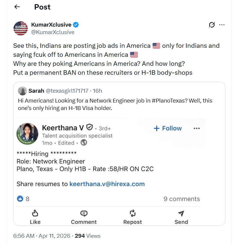 Now, another job listing is drawing attention on social media. The post, highlighted by a user named KumarXclusive, claims that some recruiters are openly favoring specific candidates. It read, “See this, Indians are posting job ads in America 🇺🇸 only for Indians and saying fcuk off to Americans in America 🇺🇸