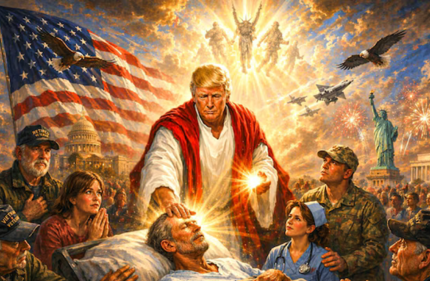 Trump didn’t stop there. In his feud against the Pope, Trump indulged in some blasphemy. Trump posted an AI-generated image that portrayed him in a Jesus-like role performing a biblical-style miracle, the digitally created picture showed him in flowing robes placing his hand on a sick man, with light radiating from his fingers as onlookers watched in reverence.